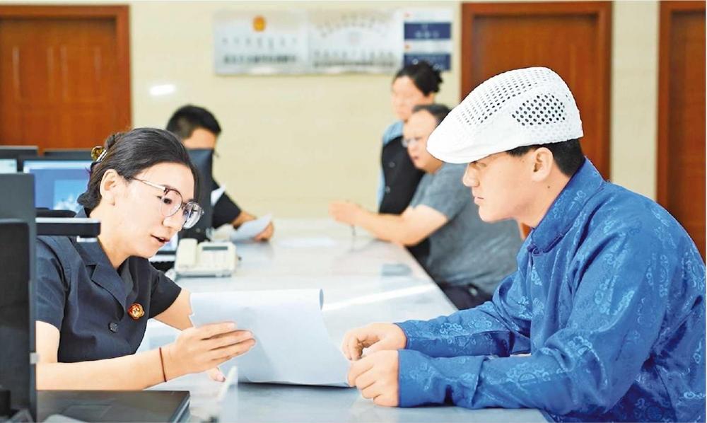 肅北縣人民法院立案庭蒙漢雙語(yǔ)法官助理接待當(dāng)事人(2025年8月拍攝)。