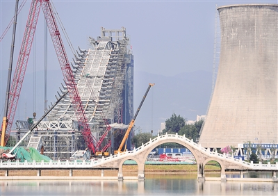北京冬奧組委踐行節(jié)儉辦奧運,對首鋼老工業(yè)園區(qū)再利用,建成滑雪大跳臺等競賽場館?;┐筇_是冬奧歷史上第一座與工業(yè)遺產(chǎn)再利用直接結(jié)合的競賽場館。圖為2019年7月工人在改造滑雪大跳臺。新華社記者 張晨霖 攝