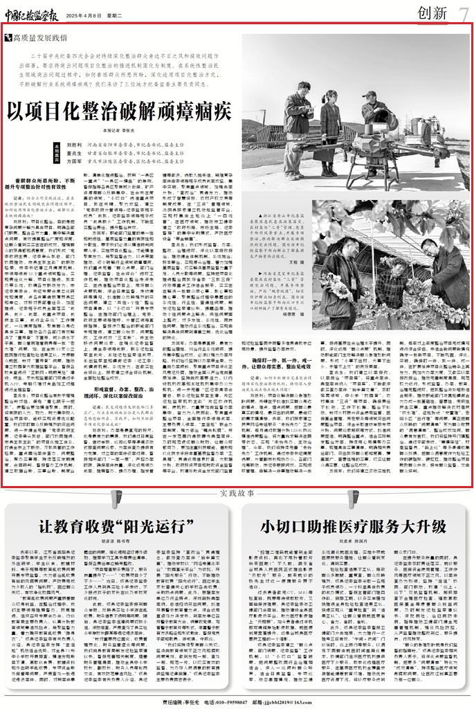 二十屆中央紀委四次全會對持續(xù)深化整治群眾身邊不正之風(fēng)和腐敗問題作出部署,要求將突出問題項目化整治的推進機制固化為制度。在系統(tǒng)性整治民生領(lǐng)域突出問題過程中,如何著眼群眾所思所盼,深化運用項目化整治方式,不斷破解行業(yè)系統(tǒng)頑瘴痼疾?我們采訪了三位地方紀委監(jiān)委主要負責(zé)同志。