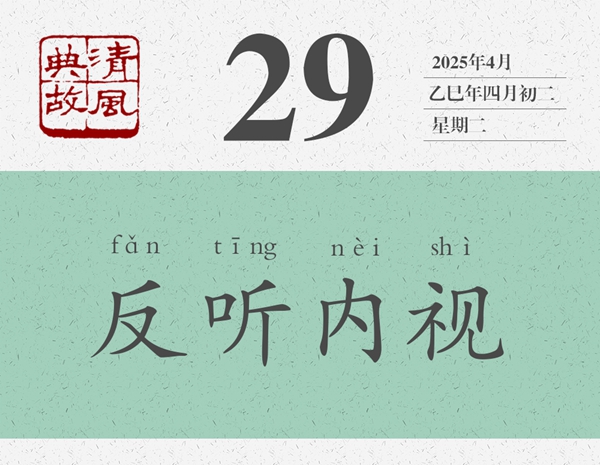 后人將“反聽之謂聰,內(nèi)視之謂明”縮減為“反聽內(nèi)視”四個(gè)字,并以此為典提醒人們,對(duì)外要虛心聽取別人的批評(píng)意見,對(duì)內(nèi)要及時(shí)反省自己的所作所為?!逗鬂h書·王允傳》:“夫內(nèi)視反聽,則忠臣竭誠;寬賢矜能,則義士厲節(jié)。”