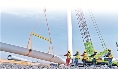 甘肅省高臺縣境內(nèi)有戈壁荒漠2000多平方公里,近年來憑借風(fēng)光資源優(yōu)勢,發(fā)力新能源產(chǎn)業(yè)賽道。圖為該縣某新能源風(fēng)力發(fā)電項目建設(shè)現(xiàn)場,工作人員正在安裝風(fēng)力發(fā)電機(jī)。新華社發(fā)