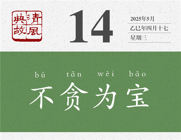 《幼學瓊林·珍寶》:“從吾所好,豈曰富而可求;有命存焉,當以不貪為寶。”“寶”有物質(zhì)層面的,也有精神層面的。有些人為了追求物質(zhì)財富,而置道德操守甚至嚴刑峻法于不顧;不要說別人主動之“獻”,甚至還會采取各種手段去“索”。有些人為了自己的尊嚴和操守,則會視來意不明、來路不清之財寶為“糞土”,他們寧愿一生清貧,也不會在金銀財寶面前心理失衡,不會在誘惑面前人格失守。