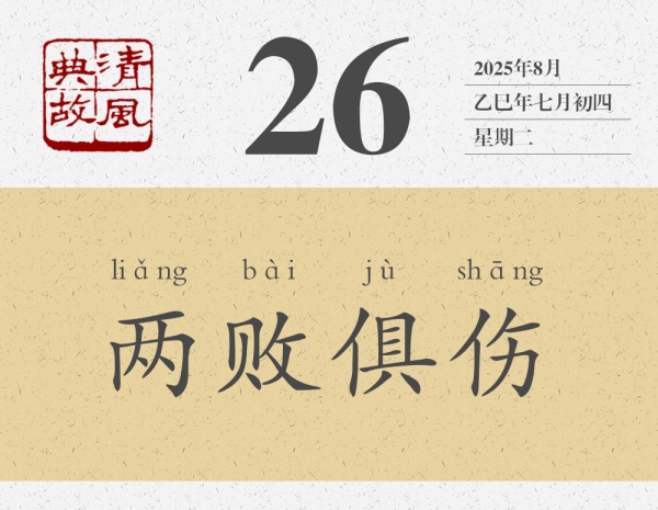 講完這個故事,陳軫言歸正傳,對秦惠王說:“今韓魏相攻,期年不解,是必大國傷,小國亡,從傷而伐之,一舉必有兩實(shí)。此猶莊子刺虎之類也。”秦惠王聽從了陳軫的建議,后來“大國果傷,小國亡,秦興兵而伐,大克之”。后世即以“兩敗俱傷”為典,比喻爭斗雙方都會受到損失,誰也得不到好處,也用來形容毫無意義的爭斗。《新五代史•宦者傳論》:“雖有圣智,不能與謀。謀之而不可為,為之而不可成。至其甚,則俱傷而兩敗。”