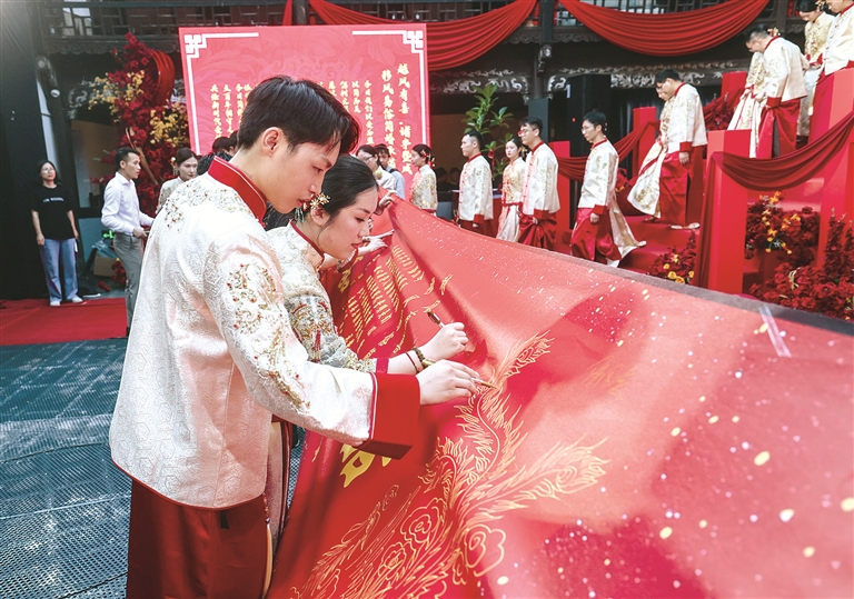 風(fēng)成于上、俗化于下。近年來(lái),越來(lái)越多新人選擇集體婚禮,倡導(dǎo)文明簡(jiǎn)約的婚嫁理念,通過(guò)精心設(shè)計(jì)的集體婚禮儀式,打造既莊重又溫馨的婚禮體驗(yàn),既減輕經(jīng)濟(jì)負(fù)擔(dān)、又傳承美好家風(fēng),倡導(dǎo)婚俗改革文明新風(fēng)尚。圖為在浙江省諸暨市西施故里景區(qū)內(nèi),參加集體婚禮儀式的新人們簽訂移風(fēng)易俗簡(jiǎn)婚承諾。新華社記者 徐昱 攝