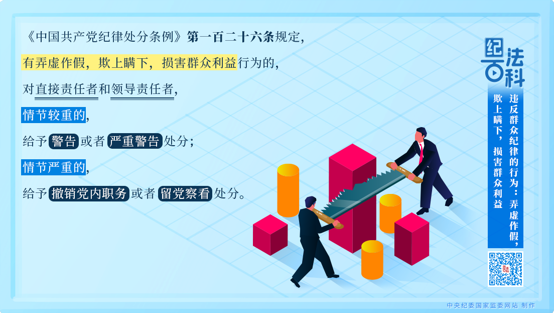《中國共產(chǎn)黨紀(jì)律處分條例》第一百二十六條規(guī)定,有弄虛作假,欺上瞞下,損害群眾利益行為的,對直接責(zé)任者和領(lǐng)導(dǎo)責(zé)任者,情節(jié)較重的,給予警告或者嚴(yán)重警告處分;情節(jié)嚴(yán)重的,給予撤銷黨內(nèi)職務(wù)或者留黨察看處分。