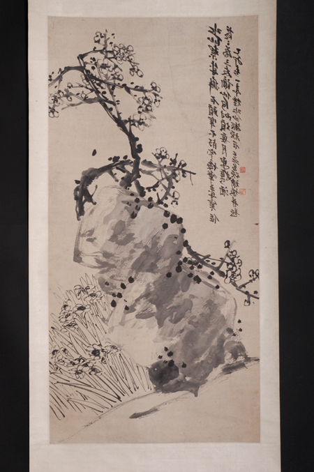 清代,水墨花鳥(niǎo)畫(huà)立軸,吳昌碩、王一亭合作,紙本。縱128.5厘米,橫63.3厘米??钍?ldquo;乙卯春一亭種水仙搬頑石,吳昌碩補(bǔ)梅并題”;鈐“缶翁”白文方印、“一亭父”朱文方印。構(gòu)圖險(xiǎn)奇,巨石斑駁渾厚,梅樹(shù)老干椏槎(chá),鐵骨錚錚,新枝旁出,穿插于其間,凌空屈曲,花開(kāi)數(shù)朵,疏落有致,石旁水仙茂盛,纖塵不染。吳昌碩、王一亭合璧之作。