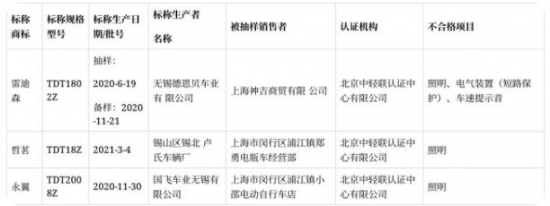 2021年上海市電動自行車產(chǎn)品質量監(jiān)督抽查不合格產(chǎn)品