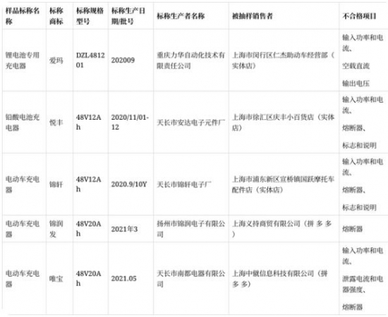 2021年長三角聯(lián)動(上海)電動自行車用充電器產(chǎn)品質量監(jiān)督抽查不合格產(chǎn)品