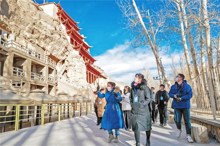 新年伊始,敦煌市舉行了“2022年-2023年冬春旅游優(yōu)惠政策發(fā)布暨敦煌文化研學季”活動啟動儀式,莫高窟推出門票半價、開放洞窟由8個增至12個并配資深講解員講解,多項優(yōu)惠措施吸引了眾多游客來敦煌觀光游覽。