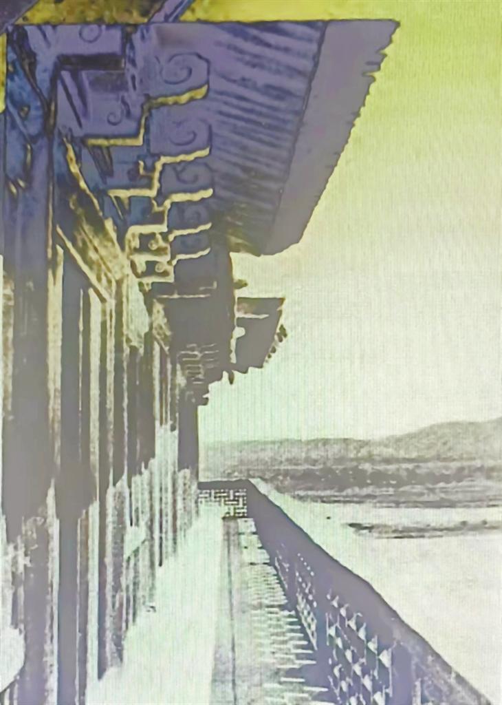林競《西北叢編》一書載,其與蘭州友人于1919年2月7日出游雷壇河臥橋,“橋長十余丈,其形如弓,橋上蓋屋,足蔽風(fēng)雨,五彩繪畫,兩端有坊,東曰‘空中鰲背’,西曰‘天上慈航’,橋底無墩,自遠(yuǎn)望之,宛如臥龍。”林競還詳細(xì)記錄了蘭州雷壇河臥橋的建造方法,并對之科學(xué)性表示肯定:“聞此橋原來有墩,因某年山洪爆發(fā),被其沖毀,自是始改今式。其法,先將兩岸之橋基筑好,以數(shù)丈長之巨木直列成排,復(fù)以橫木連之,木材之?dāng)?shù),依橋之寬狹而定,其前端伸出橋中約二三尺,其后端即以巨石壓之,如是疊架不已,每加一層,即前端伸過下層數(shù)尺,如倒掛之階梯然。而層與層之間,復(fù)聯(lián)以鐵環(huán)及釘木,迨兩岸相距不遠(yuǎn)時(shí),即以巨木渡之。此種構(gòu)造,在西北往往因河水湍急,不能筑墩,或游牧之民,不知在河中建筑橋墩之法而始用之。然亦甚合於力學(xué)原理,未可忽視也。”
