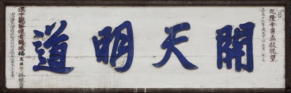 該匾懸于天水伏羲廟大門前牌坊正中。長3.5米,寬1.25米,厚0.12米。素邊,匾心白底藍字,上下款朱書。此匾有雙上款和雙下款。第一個上款為“乾隆辛酉孟秋既望”,下款為“湟中觀察使者遼海楊應琚薰沐敬書”;第二個上款為“嘉慶十二年歲次丁卯五月吉旦”,下款為“中憲大夫寧夏府知府候補知秦州事王公重建”。