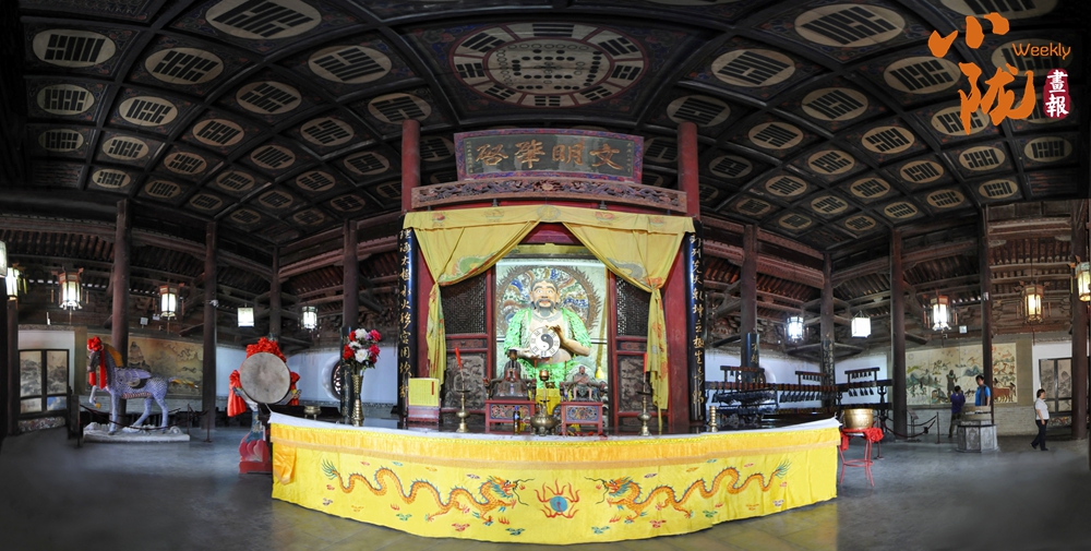 先天殿莊嚴(yán)肅穆,殿內(nèi)正中便是高達(dá)3米的人文始祖伏羲坐身塑像,樹葉披身,手持八卦盤,氣宇軒昂,雙目炯炯凝視前方,神龕上方懸掛著清嘉慶時州牧王賜均書“文明肇啟”巨匾,仰頭上望,頂上繪有河圖洛書、六十四卦,令人肅然起敬。