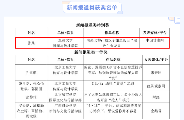 蘭州大學(xué)新聞與傳播學(xué)院獲獎(jiǎng)中,張凡的作品《南果北種!糙漢子棚里種出“綠色”火龍果》在中國(guó)甘肅網(wǎng)刊發(fā),系蘭州大學(xué)新聞與傳播學(xué)院、中國(guó)甘肅網(wǎng)聯(lián)合舉辦的第十三屆“重走中國(guó)西北角”接力采訪活動(dòng)新聞作品。