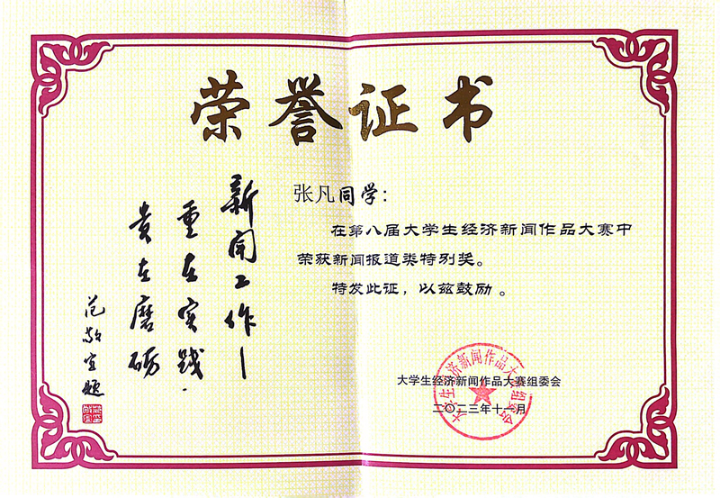 張凡獲獎(jiǎng)榮譽(yù)證書(shū)