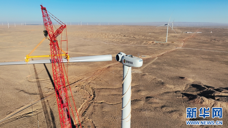 隆冬季節(jié),在甘肅省張掖市甘州區(qū)平山湖風(fēng)電基地國家電投10萬千瓦風(fēng)電項(xiàng)目建設(shè)工地,工人正在進(jìn)行風(fēng)機(jī)葉片吊裝作業(yè)。