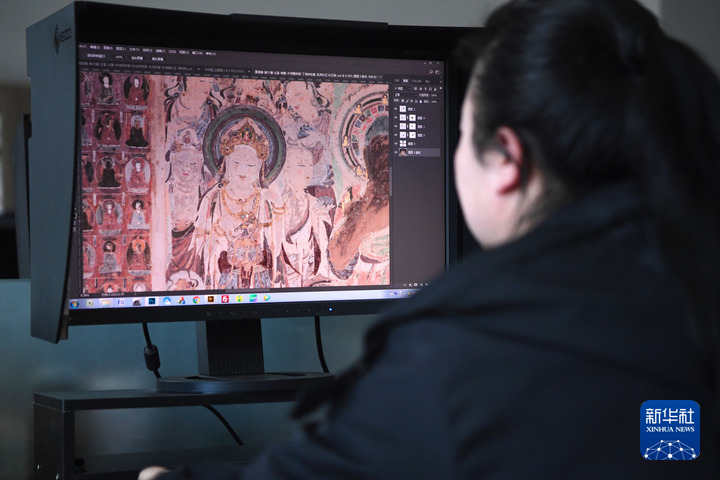 4月25日,敦煌研究院文物數(shù)字化保護團隊圖像處理人員年海麗在拼接壁畫圖像。新華每日電訊記者 陳斌 攝