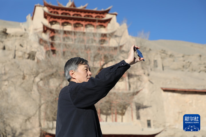 2022年2月23日 敦煌研究院院長蘇伯民正在用手機進行“數(shù)字敦煌”體驗。新華每日電訊記者 張睿 攝