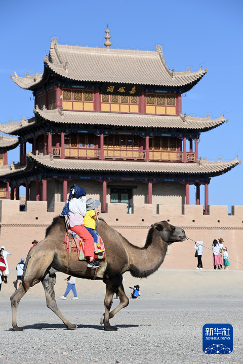 8月7日,游客在嘉峪關(guān)關(guān)城外騎駱駝。新華每日電訊記者 范培珅 攝