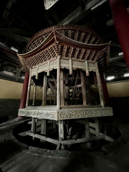 轉(zhuǎn)輪藏指可以轉(zhuǎn)動的經(jīng)書架。它始建于北宋、直徑達(dá)7米,榫卯相嵌形成一座古樸的八角亭。八根方柱自頂部向下收縮,將重量匯至一點。“如此巨大的木建筑,一兩人就能推動,常令游客驚嘆。”正定縣隆興文化旅游發(fā)展有限公司講解員王瑋瑤說。