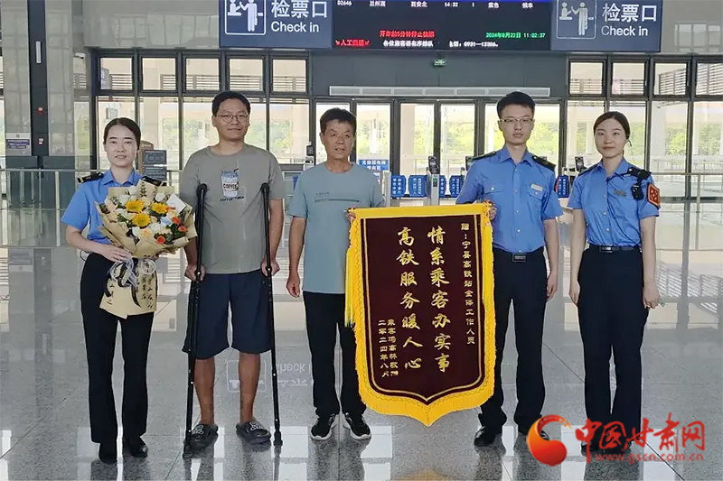 中國(guó)甘肅網(wǎng)8月29日訊(西北角·中國(guó)甘肅網(wǎng)記者 沈文剛 通訊員 閆軍 王梁)8月22日,正值處暑節(jié)氣。隴東地區(qū)籠罩在“秋老虎”的悶熱之中。上午10時(shí),一位拄著雙拐的男士在家人陪伴下,帶著鮮花和錦旗來(lái)到銀西高鐵寧縣站候車室。