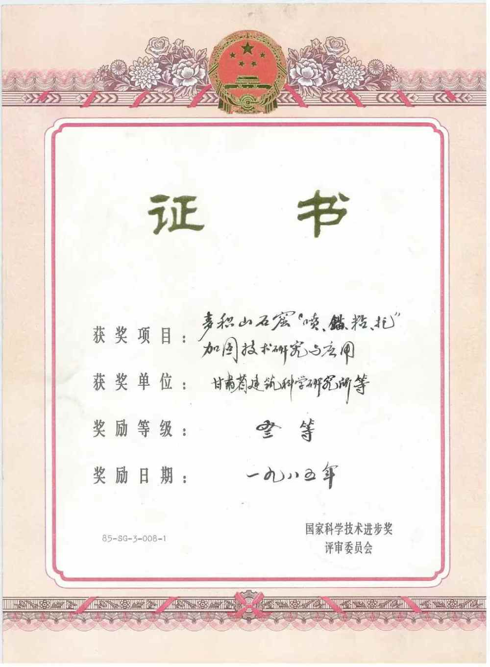 鑒定認(rèn)為,麥積山石窟維修加固工程在總結(jié)了國內(nèi)巖體加固經(jīng)驗的基礎(chǔ)上,結(jié)合麥積山石窟巖體的特點和不改變原狀的原則,成功地采用了“噴、錨、粘、托”綜合加固技術(shù),為保護石窟文物開創(chuàng)了一條新的途徑。1985年,甘肅建科院榮獲國家科技進步獎三等獎、甘肅科技成果獎二等獎。