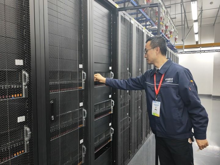 國家數(shù)據(jù)中心集群(甘肅·慶陽)“東數(shù)西算”產(chǎn)業(yè)園區(qū),工作人員在機(jī)柜旁作業(yè)(2024年10月28日攝)。新華社記者 梁軍 攝