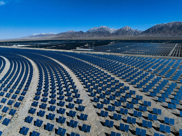青海省海西蒙古族藏族自治州德令哈市光伏(光熱)產(chǎn)業(yè)園的光熱電站(2024年4月23日攝,無人機(jī)照片)。新華社記者 張龍 攝