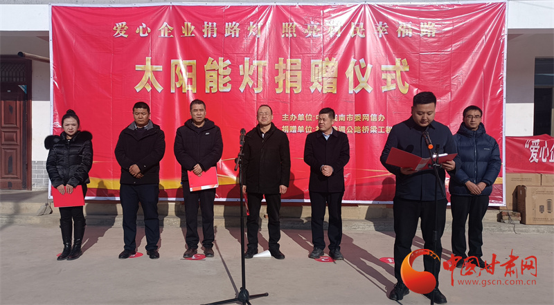 當(dāng)日,隴南市委網(wǎng)信辦還聯(lián)合禮縣工商聯(lián)、禮縣鼎通公路橋梁工程有限公司舉辦了“愛心企業(yè)捐路燈 照亮村民幸福路”捐贈儀式,為李壩村捐贈價值5萬元的260盞太陽能路燈,助力美麗鄉(xiāng)村建設(shè),照亮村莊夜晚。