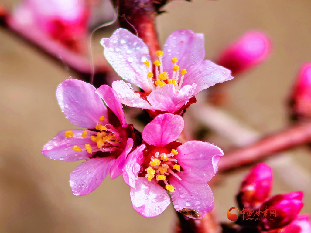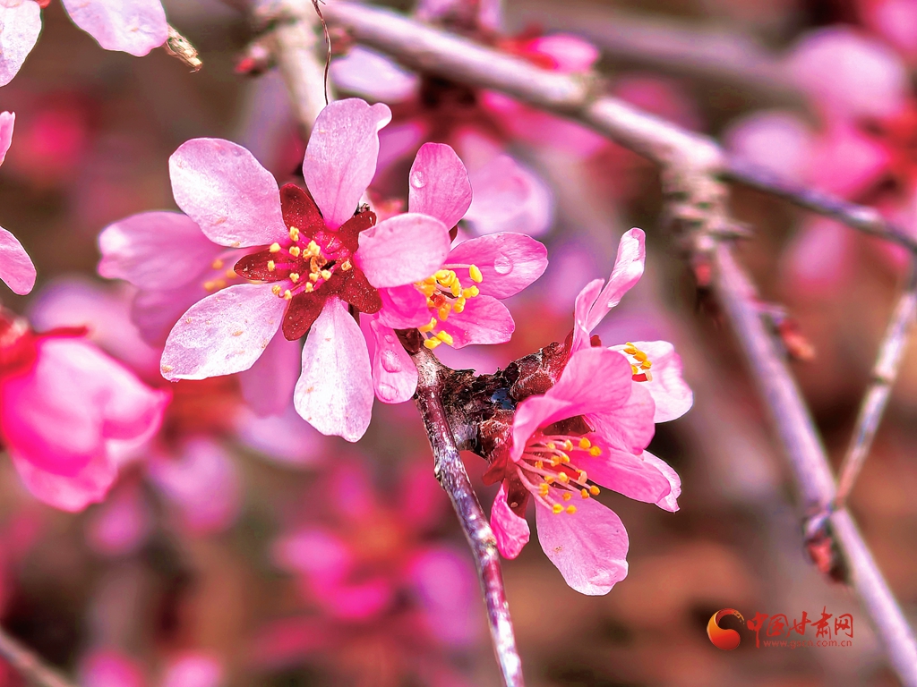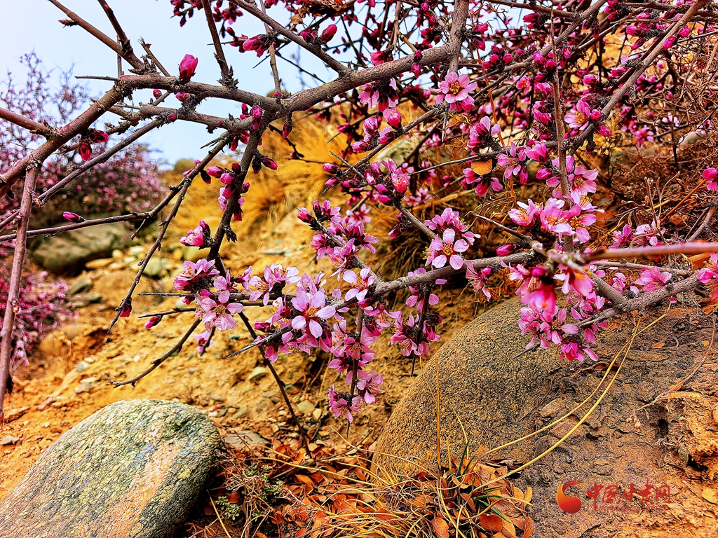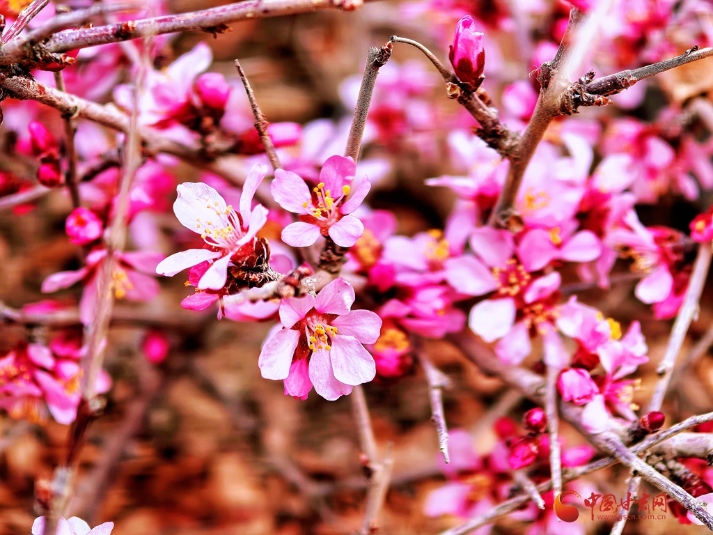 光禿禿的枝條上,不見半片新葉,只有一簇簇、一團(tuán)團(tuán)粉紅色的小花,密密匝匝地綴滿枝頭,擠擠挨挨,溫暖又熱烈。遠(yuǎn)遠(yuǎn)望去,像一縷輕盈的粉紅色云煙,輕輕飄落在蒼黃的山坡上,為沉寂的祁連山添上一抹難得的溫柔亮色;走近細(xì)看,花瓣薄如蟬翼,質(zhì)地輕盈細(xì)膩,嫩黃的花蕊纖細(xì)挺立,在寒風(fēng)中微微顫動(dòng),看似柔弱的外表下,藏著不屈的傲骨。偶爾一場(chǎng)春雪突襲,潔白的雪花壓彎枝頭,花朵看似垂落不堪,可待到雪化風(fēng)輕,它便立刻挺直腰肢,重新舒展花瓣。夜里寒霜凍得花瓣晶瑩透明,仿佛一碰就碎,可朝陽升起,寒冰慢慢消融,花朵依舊盛放如初,不曾輕易凋零半分。