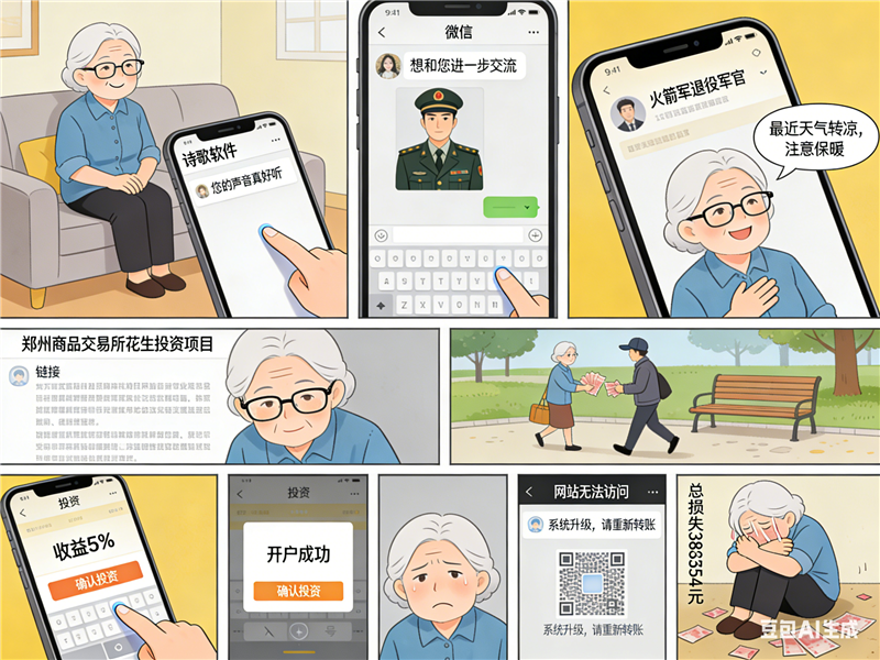 警方拆解該案騙術(shù)發(fā)現(xiàn),騙子共分七步將紀(jì)奶奶從“詩(shī)友”變成“提款機(jī)”。第一步,潛入詩(shī)歌朗誦這類中老年人聚集的興趣社群,精準(zhǔn)篩選目標(biāo);第二步,以“聲音好聽(tīng)”為切入點(diǎn),通過(guò)情感鋪墊營(yíng)造“黃昏戀”錯(cuò)覺(jué),建立情感依賴;第三步,多次切換聊天軟件,躲避平臺(tái)反詐監(jiān)測(cè);第四步,偽裝“火箭軍”身份,利用老一輩對(duì)軍人的天然信任感,以國(guó)家信譽(yù)背書(shū);第五步,讓老人幫忙操作虛假賬戶,親眼見(jiàn)證“穩(wěn)賺5%”的假象;第六步,邀請(qǐng)老人自己投資,誘導(dǎo)其向個(gè)人銀行卡轉(zhuǎn)賬;第七步,要求線下現(xiàn)金交易,繞過(guò)銀行風(fēng)控,增加資金追回難度。