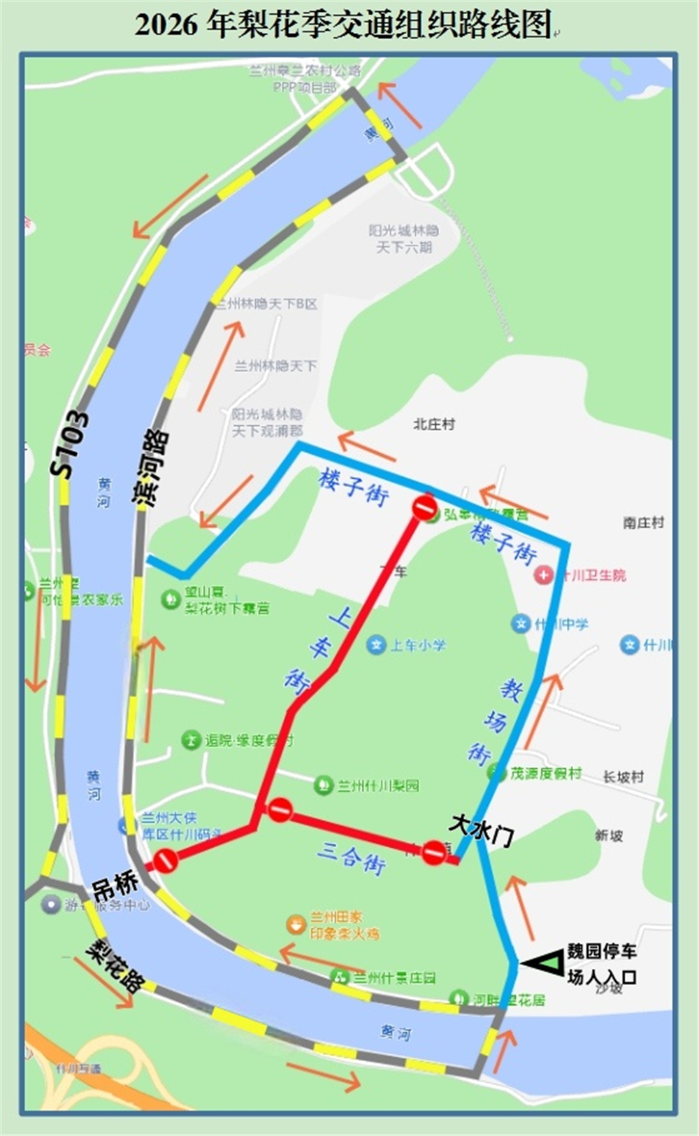 什川古梨園百年古梨樹枝繁葉茂,春日梨花滿枝、如雪似霞,每年梨花節(jié)都是市民游客春日打卡的熱門目的地。為應對節(jié)日期間的車流高峰,皋蘭縣政府聯(lián)合縣公安局及各相關部門,制定了科學的交通組織方案,并繪制了2026年梨花季交通組織路線圖,明確了景區(qū)內外循環(huán)通行規(guī)則與停車區(qū)域。