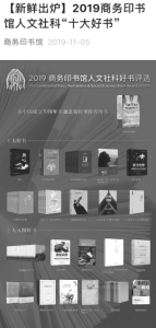 “商務(wù)印書館人文社科好書評選”被中央電視臺等媒體稱為“年度圖書榜單風向標”。每每公布后,央媒及主流媒體都會予以報道,同時在新媒體平臺也會進行系列宣傳,比如2019年的好書評選人民日報官方微信發(fā)布后一天內(nèi)的閱讀量便超過了888萬。