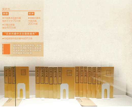 據(jù)聯(lián)合國(guó)教科文組織調(diào)查統(tǒng)計(jì),目前在全球47個(gè)國(guó)家和地區(qū)的200多座博物館中,記錄在案的中國(guó)文物有167萬(wàn)件,而流散在海外民間的約是此數(shù)目的10倍,這些文物中間包括大量的古代典籍文獻(xiàn)。據(jù)研究,美國(guó)現(xiàn)存中國(guó)善本線裝古籍不少于70萬(wàn)冊(cè),古籍總數(shù)量接近400萬(wàn)冊(cè);歐洲粗略估算古籍有200萬(wàn)冊(cè);流入日本的中國(guó)古籍更多,“日本所藏中文古籍?dāng)?shù)據(jù)庫(kù)”中便可檢索到91萬(wàn)條漢籍書(shū)目。國(guó)外各大公共圖書(shū)館、大學(xué)和研究機(jī)構(gòu)圖書(shū)館以及民間收藏的典籍文獻(xiàn)至今尚無(wú)系統(tǒng)的明確統(tǒng)計(jì)數(shù)據(jù)。