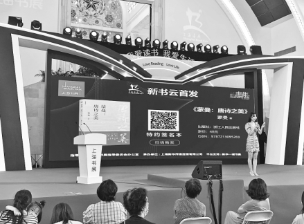 2020上海書展首次啟用了新書“云首發(fā)”的形式。8月15日,在《蒙曼:唐詩之美》新書“云首發(fā)”現場,讀者可以掃描大屏幕上的二維碼進行圖書購買。