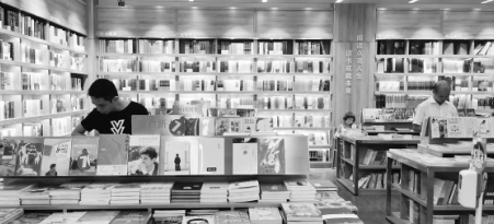 9:00,書店開始營業(yè)。走進書店,看到店內裝修色調溫和,視野開闊,藏書豐富。臨門迎接讀者的是位于正中央的圓形桌臺,上陳列各類精品圖書,擺放造型精美,儀式感十足。沿著桌臺外圍是一圈白色座位,可供讀者坐下閱讀。