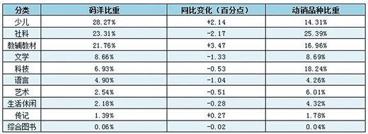 從細分市場情況來看,中小學幼兒園教材、法律、傳記、學術文化、教輔和少兒類呈現(xiàn)正向增長,其余類別均表現(xiàn)為同比負增長。