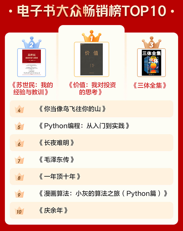 通過電子書暢銷榜TOP10和有聲暢銷榜TOP10可以看出,很多人愈發(fā)關注投資和管理等方面的內容,也愈發(fā)注重個人學習?!秲r值:我對投資的思考》《蘇世民:我的經驗與教訓》 分別位居電子書暢銷榜第一名和第二名?!吨袊洕?020》《原則》進入有聲暢銷榜前十。此外,學習類圖書《Python編程:從入門到實踐》《漫畫算法:小灰的算法之旅(Python篇)》也上榜電子書暢銷榜前十。