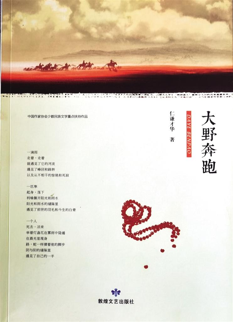 詩歌集《大野奔跑》是仁謙才華近年來的傾心之作,該作品由敦煌文藝出版社出版發(fā)行。詩集由作家張存學(xué)作序,收錄了仁謙才華4年來發(fā)表在《詩刊》等刊物上130余首詩歌。張存學(xué)在序中這樣評價:“語言,既是阻礙,也是抵達(dá)之路,這個緊張度也是考驗一個寫作者的坎,這個坎過得好一些就能夠把握住詩抵達(dá)生命的本真,把握不好,就會在空泛的意象中游走。仁謙才華在這方面的蛻變,從他這本詩集能夠看出,他由早期的直抒胸意、向外張揚(yáng)變得安靜起來,變得從容而多思,也變得獨立而內(nèi)在……”