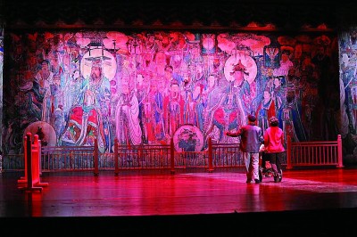 《永樂宮紀(jì)事》創(chuàng)造性地將蒲劇、歌劇、舞劇、話劇、音樂劇等多種藝術(shù)形式有機(jī)結(jié)合、融為一體,在充分利用地域文化元素的同時(shí),還將珍貴的永樂宮壁畫與現(xiàn)代聲光電等舞臺(tái)技術(shù)有機(jī)結(jié)合,營(yíng)造出絢麗多彩的舞臺(tái)效果。