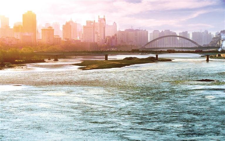 河分南北,勢(shì)接?xùn)|西。舒寧陜之博帶廣袖,帶青藏之峨冠雪衣。山逶迤而續(xù)祁連,水澎湃而瀉右?guī)?。匯洮湟之迤邐,有容乃大;與華夏之康莊,唇齒相依??睾游髯呃龋怨哦?;俯渭涇秦川,由朝至夕。綴葫蘆狀岸渚坪灘,幾多古渡;依膏腴處坡谷盆地,即就蕃息。筑虹蜺經(jīng)百年,鐵橋第一;盤游龍於今朝,立交數(shù)十。去病鞭地,五泉山勝于秀逸;永誠(chéng)建院,白塔寺高于云齊。指點(diǎn)九州,大禹登九州之臺(tái);漂流黃河,洋人恐招手之磯。草覆馬銜而能牧,林茂興隆云可棲。繞營(yíng)盤高嶺排五,峙雄關(guān)沿河有七。留千古名,白馬浪細(xì)聽湍流不息;鎖萬(wàn)代鑰,金城關(guān)只留站牌不奇。雷壇留碑,金天觀曾殿宇壯麗;華林無(wú)寺,節(jié)能燈照幽路石基。湍流黃河,九曲回腸依然東去;水轉(zhuǎn)輪盤,十方高地亦滿紛披。