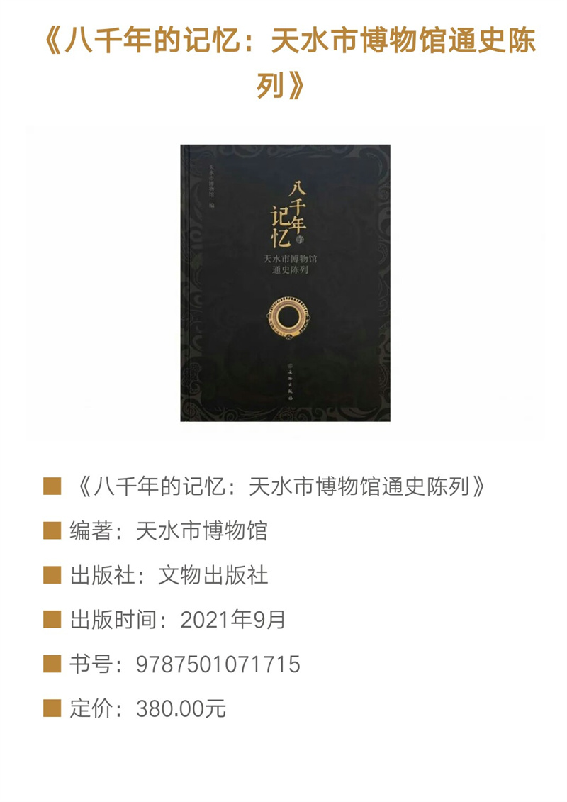 《八千年的記憶——天水市博物館通史陳列》文物圖錄一書在編輯出版過(guò)程中,凝聚了眾多工作人員的心血。天水市博物館學(xué)術(shù)研究部在文物的遴選確定、資料整理、編寫、校對(duì)方面做了大量的工作,文物保管部在文物照片拍攝、文物信息提供方面積極配合、全力協(xié)助,信息中心在展廳照片拍攝方面提供了幫助。本書中部分插圖,由甘肅省博物館、甘肅省文物考古研究所、麥積山石窟藝術(shù)研究所、張家川回族自治縣博物館友情提供。今由文物出版社正式出版,文物圖片精美、文字說(shuō)明簡(jiǎn)潔明快,希望更多的讀者通過(guò)此書認(rèn)識(shí)天水,也希望更多的人能夠因?yàn)榇藭H臨天水市博物館感受天水厚重的歷史文化。