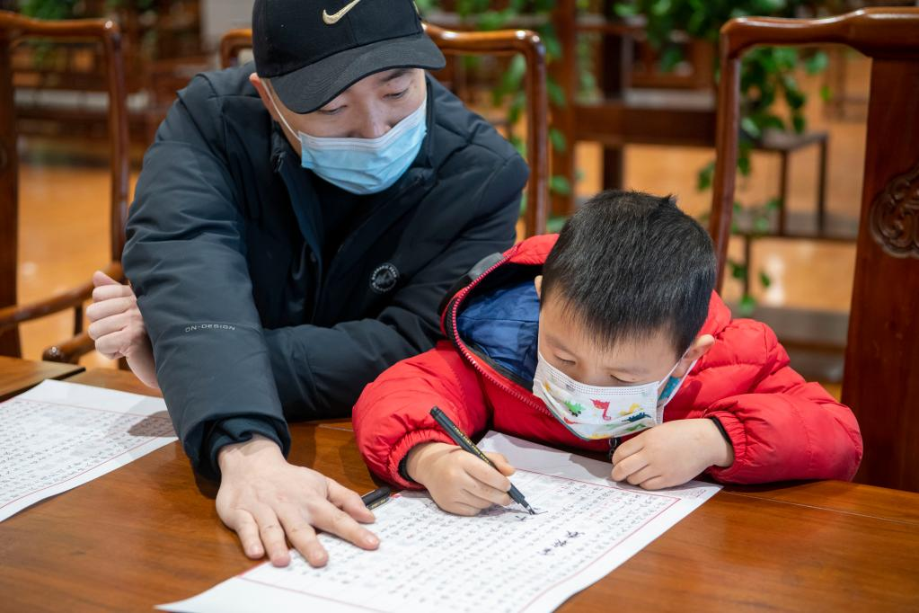 2月6日,小朋友和家長(zhǎng)在太原市圖書館參加“觀四庫(kù) 抄經(jīng)典”活動(dòng)。