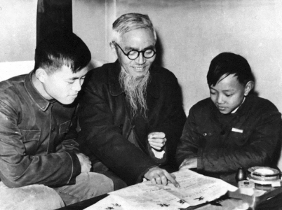 1955年,宋菲君(右)與外公豐子愷(中)一起讀報。
