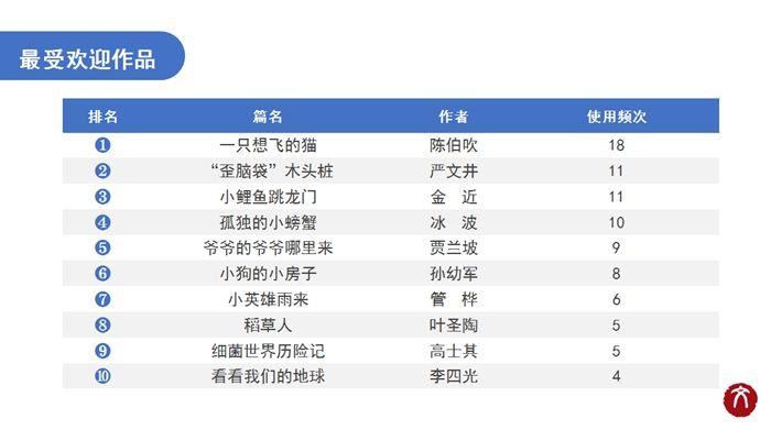 2021年度十大作品榜單為:《一只想飛的貓》(作者陳伯吹)、《“歪腦袋”木頭樁》(作者嚴文井)、《小鯉魚跳龍門》(作者金近)、《孤獨的小螃蟹》(作者冰波)、《爺爺?shù)臓敔斈睦飦怼?作者賈蘭坡)、《小狗的小房子》(作者孫幼軍)、《小英雄雨來》(作者管樺)、《稻草人》(作者葉圣陶)、《細菌世界歷險記》(作者高士其)、《看看我們的地球》(作者李四光)。