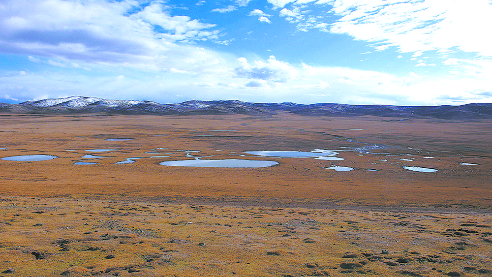 約古宗列位于青藏高原東北部,海拔高度在4200米~4800米,地勢(shì)西北高,東南低。站在腳下小泉邊,抬眼先看到的是西面距我們最近的雅合拉達(dá)合澤山,它是1952 年新中國(guó)第一個(gè)河源查勘隊(duì)曾認(rèn)定的黃河源頭山。南望,遠(yuǎn)處最高的雪峰,是長(zhǎng)江黃河的分水嶺巴顏喀拉山;視線左移,東方藍(lán)天白云下,同樣白雪皚皚的是阿尼瑪卿山。以約古列宗為中心輻射,在這東西長(zhǎng)約220 公里,南北最大寬150 公里的高山草甸帶與高山草原帶的過渡地帶,東面阿尼瑪卿山阻擋了東南暖濕氣團(tuán)西進(jìn),南面巴顏喀拉山又削弱了溯谷地北進(jìn)的西南季風(fēng)勢(shì)頭,再加之北面布爾漢布山的屏障作用,把源區(qū)與干旱的荒漠地區(qū)隔開,使這里年平均氣溫在-4℃左右。青藏高原半濕潤(rùn)地區(qū)氣候和遠(yuǎn)處雪山冰川的不斷融化,使母親河上源的兩眼泉和其他那些數(shù)不清的泉,源流不斷,經(jīng)年汩汩。