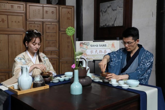 “詩畫江南 行閱典籍”曬書活動之“宋式點(diǎn)茶”。費(fèi)騰輝攝