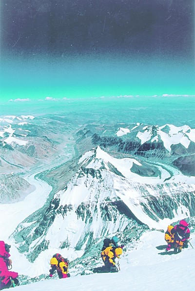 自1953年以來,人類以無與倫比的勇氣和日臻成熟的登山技巧,不斷地向珠穆朗瑪峰進(jìn)發(fā)。年復(fù)一年的登頂,在喜馬拉雅山脈蒼茫的峰嶺,寫下厚重的英雄史詩。1953年5月29日,新西蘭人埃德蒙·希拉里和向?qū)Уぴ?middot;諾爾蓋,從珠穆朗瑪峰南坡登頂,戴上人類歷史上第一次登頂珠峰的桂冠。1960年5月25日4點20分,中國登山隊隊員王富洲、屈銀華、貢布(藏族)經(jīng)過艱苦卓絕的攀登,終于首次從北坡登上地球最高的山峰珠穆朗瑪峰頂峰。中國人創(chuàng)造了世界登山史的新紀(jì)錄。經(jīng)過多年堅忍不拔的努力,登頂珠穆朗瑪峰從夢想變成現(xiàn)實。從1953年至1999年,1169人次登頂珠峰。從2000年到2015年,5832人次登頂珠峰。到2015年,世界上已有7001人次登頂珠峰。