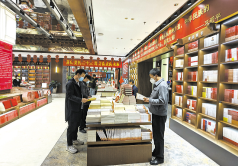 10月17日,記者在河南省洛陽(yáng)市新華書(shū)店看到,“喜慶二十大 奮進(jìn)新征程”主題出版物展示專(zhuān)區(qū)重點(diǎn)陳列了《習(xí)近平談治國(guó)理政》第一卷至第四卷、《百年初心成大道》等數(shù)百種黨政理論學(xué)習(xí)讀物,吸引了廣大讀者駐足閱讀。