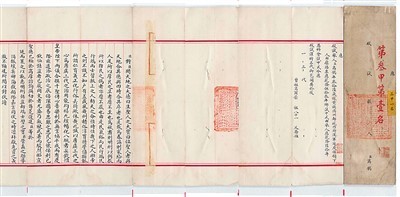 來(lái)自鎮(zhèn)江市圖書(shū)館的《封贈(zèng)文藻父母誥命》是清廷頒給張家口左翼正白旗滿(mǎn)洲四品銜驍騎校文藻父母的誥命,內(nèi)容為封賜文藻之父賡吉圖為昭武都尉,其母額哲特氏為恭人。這幅圣旨由黃、赤、紫三色錦織就,卷頭和卷尾分別織有漢、滿(mǎn)文“奉天誥命”4字,字兩旁有升龍和降龍盤(pán)繞紋樣。此誥命的制誥時(shí)間為光緒三十四年(1908年)十一月初九,當(dāng)時(shí)光緒帝已經(jīng)去世,宣統(tǒng)帝于此日即位。