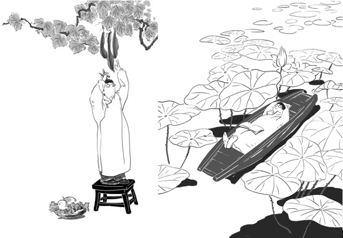 綠葉扶紅花,雅閣、秋雨為這本書的配圖也頗有特色。隨筆《理想與鄉(xiāng)愁》的封面,是一位戴著眼鏡、長相酷似作者的文人站在小凳子上,準備將掛在枝頭的絲瓜摘下來以供午餐之需,腳旁一只狗狗看守著筐子里的兩個大水蘿卜。這幅圖與左面的書名遙相呼應(yīng):作者的“理想”與“鄉(xiāng)愁”就在絲瓜藤下結(jié)為了一體。詩集《人生歸處是田園》的封面是三株樹下,那位戴眼鏡的文人坐在長椅上,望著右面空椅子上的三只小鳥,一付若有所思的樣子;而葉廷芳為詩集所寫序言文末的尾花,還是這幅圖,只不過沿縱軸轉(zhuǎn)動180°——文人從右面望向左面。一里一外兩幅畫互為鏡像,似乎是暗示人們,藝術(shù)就是社會生活既真實又不完全一樣的反映。